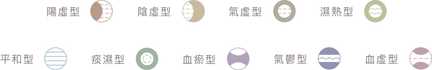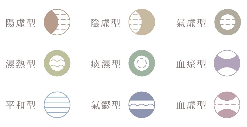 中醫理論依據人們的飲食生活、身體特徵、疾病 症狀等等歸納出了九種體質,人們常因不同條件 產生體質變化,而疾病與體質也存在著因果關係,所以學習認識體質是非常重要的。